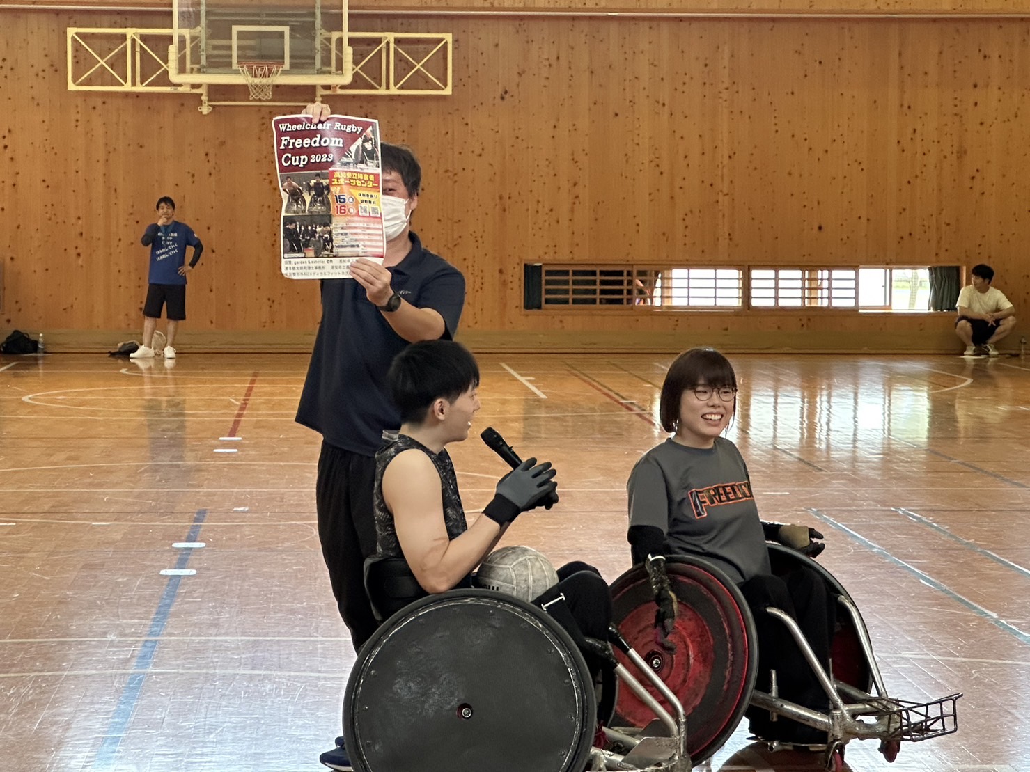 皆さん こんにちは。昌也です。 さてさて今月17日に、スポーツセンター体育館で県内社会福祉協議会の職員が集い、交流を兼ねた運動会が開催されました。 プログラムは、王道の玉入れや綱引き、アイディアに富んだジェスチャーゲームなど、子どもから大人まで約100人が参加し、大盛り上がりでした。 赤、青、黄、白 どの4チームも接戦が続き、終始歓声がわきます。 最終種目は、車いすラグビー用車いすに乗っての「車いすリレー」。 なんと飛び入りで、高知県車いすラグビーチーム「Freedom(フリーダム)」より、次世代を担う若手選手 森澤 知央さん、白川 楓也さん、そして土佐車いすサービスの代表兼ハンドサイクルの選手として活躍される西原 健一さん、最後に本センターのアネさんこと永島 真子が、各チームのアンカーとして参加してくれました! センター所長の北村のナイス(?)な選手紹介に、レース前から会場は盛り上がりを見せました。 そしていざ、レーススタート!! 一人ひとりが、日頃触れることのない競技用車いすの操作に苦戦しながらも頑張り、バトンを繋ぎます。 バトンは各アンカーに渡され、そのナイスランに応援の声が挙がりましたっ‼ この運動会は長年にわたって開催されていますが、このようなパラアスリートとの触れ合いは初めてかと思います。 皆さんにとって、きっといい思い出になったことでしょう♪ 最後になりますが、7月15日、16日にセンター体育館で車いすラグビーの大会「Freedom Cup 2023」が開催され、Freedom、県外強豪チームとの熱いバトルが繰り広げられます。 森澤選手、白川選手 お2人のご健闘をお祈りしています(^^) ![]() ![]() |